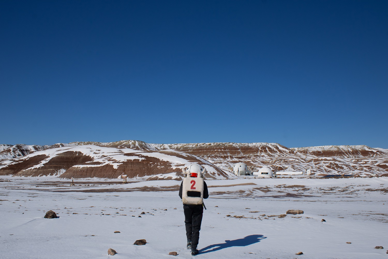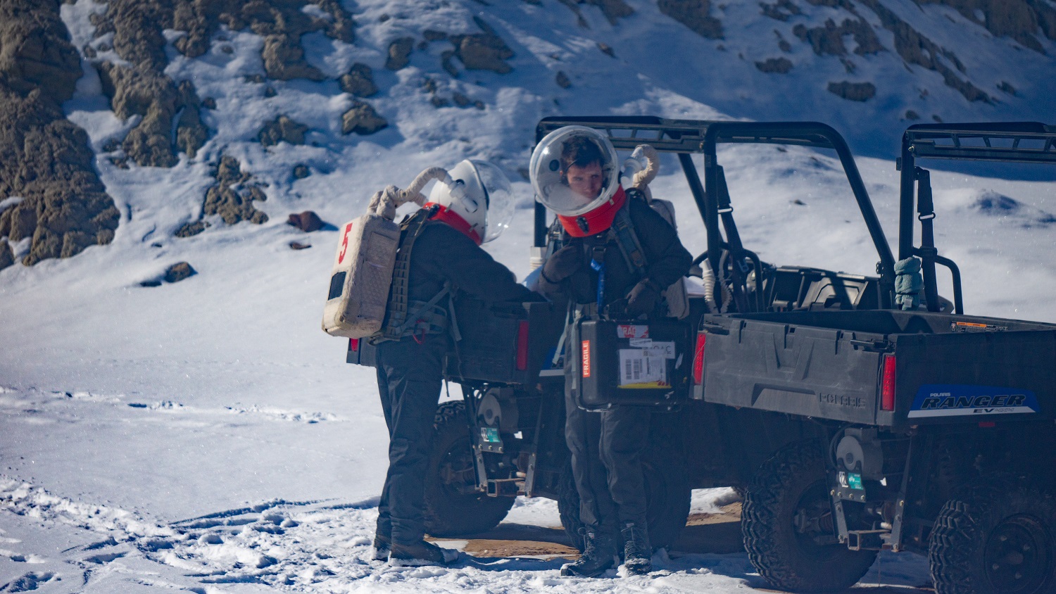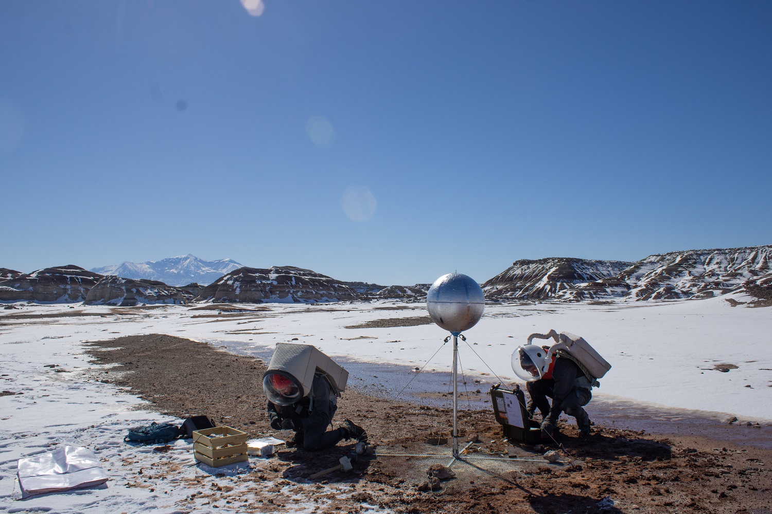 This morning, Mars offered us clear skies and biting cold : the weather station read -17°C at 6:45 when we woke up ! As we were beginning to complete our daily surveys and health check, still half asleep, the power suddenly went out. Jérémy immediately contacted Mission Support, who responded quickly, and the power came back a few minutes later, though enough time passed for us to start to feel the cold seep through the Hab walls… and give us a taste of what awaited out there in the Martian atmosphere! The EVA to install MegaAres being scheduled in the morning, we regularly checked the temperature as we got ready. By 10am, we had reached -10°C! Warmly dressed and equipped with our spacesuits, Alexandre, Corentin and I stepped into the airlock for depressurization, led by Quentin, our HabCom.