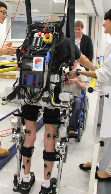 - MINDWALKER : consortium de plusieurs universités et instituts de recherche menés par Space Applications, le but de ce programme de recherche est également de développer un exosquelette d’aide au déplacement, mais cette fois directement contrôlé par le cerveau de l’utilisateur : l’activité électrique du cerveau (électroencéphalographique) est mesurée par des électrodes et traduite en mouvements de la machine, comme une marche naturelle. Plusieurs patients handicapés ont déjà pu bénéficier de cette technologie.