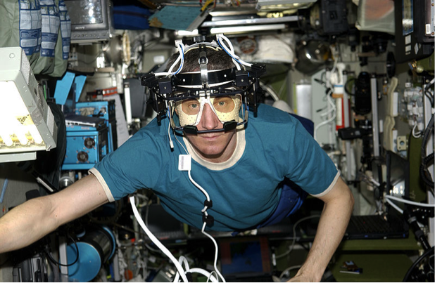 Le cosmonaute Sergueï Krikaliov portant un dispositif d’eye-tracking, permettant de mesurer son attention et ses réactions physiologiques.