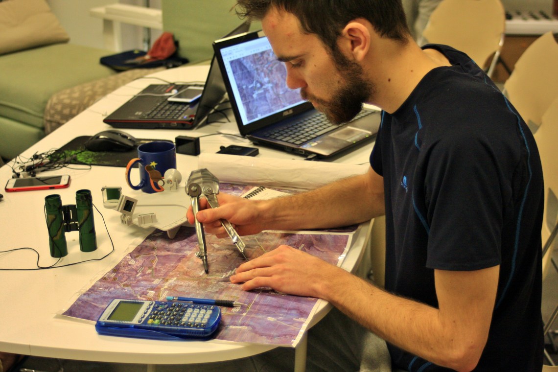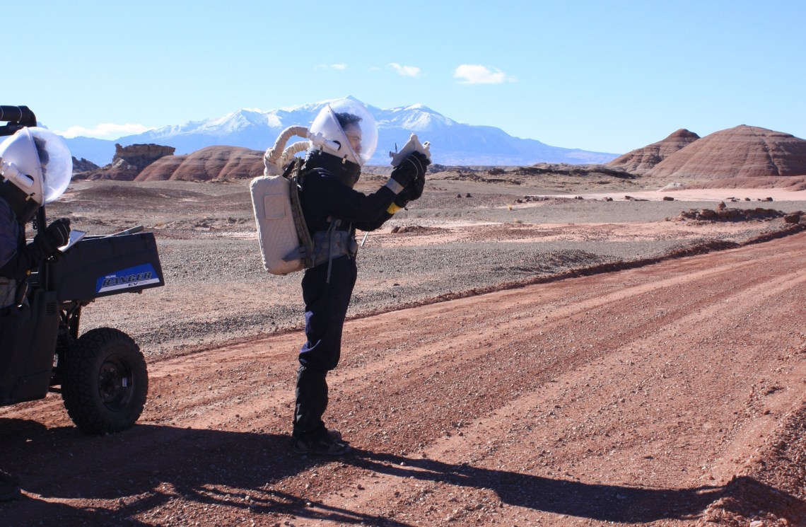 L’EVA du jour était censée être rapide : nous avions prévu d’enterrer le sismomètre plus profond, d’explorer au nord de la station pour tester le sextant en terrain inconnu, et enfin faire des opérations de maintenance autour de la station. Nous avons démarré la journée un peu plus tard que d’habitude, car nous avions prévu le départ pour 9h30 au lieu de 9h. L’EVA était menée par Victoria, accompagnée d’Arthur, Mouâdh et Xavier, le photographe du jour. La première étape était de partir au Sud pour enterrer le sismomètre plus profond. Il était en contact avec la plaque le protégeant depuis les dernières intempéries. Cela prit moins d’une demi-heure de creuser un trou plus profond dans le sol, et d’y fixer à nouveau le capteur. Pendant ce temps, Arthur utilisait le sextant pour tester les coordonnées mesurées dans ce lieu connu. Au passage, si nous utilisons un sextant, l’instrument de marine, c’est parce qu’une boussole serait inutilisable sur Mars, le champ magnétique étant beaucoup trop instable.