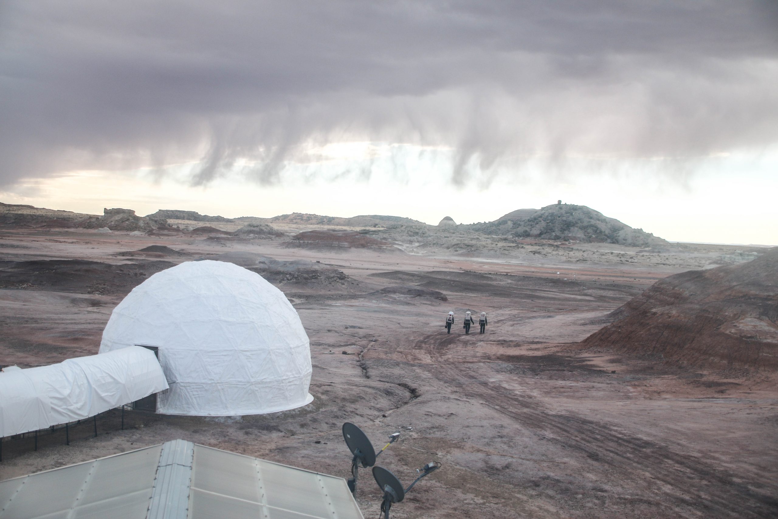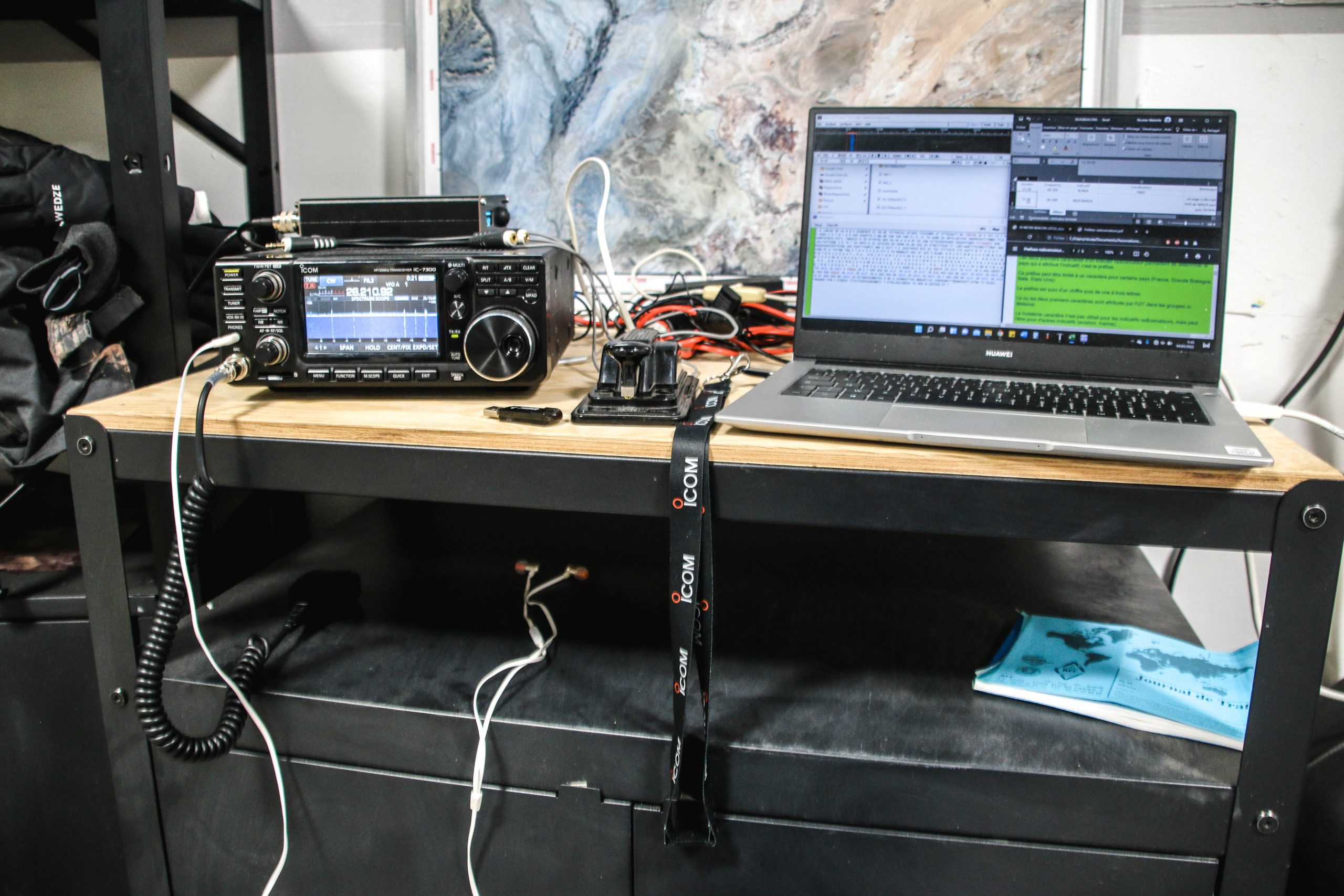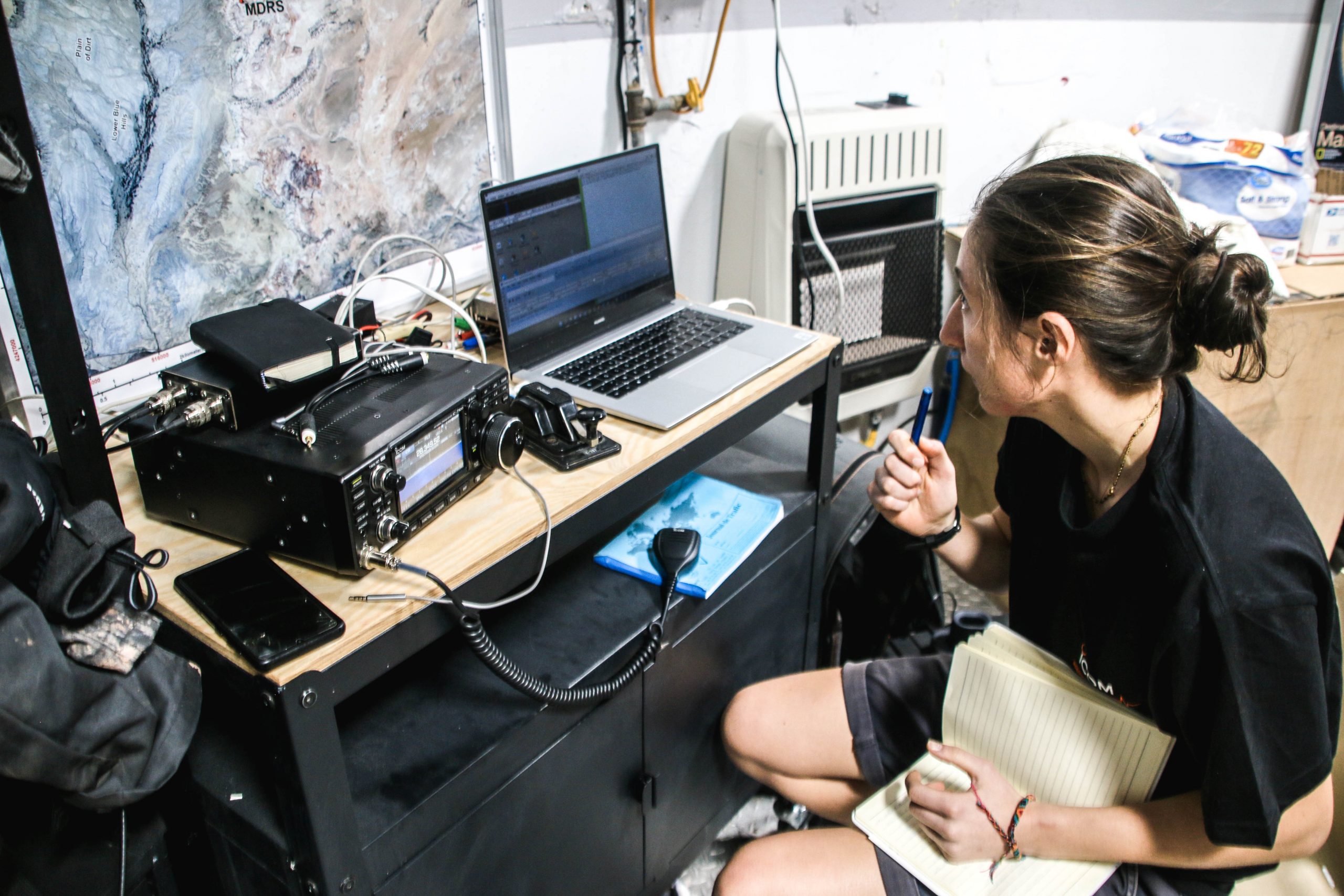 Le protocole établi utilise 3 modes de modulation (manières de transformer l’onde pour envoyer un message avec) avec des noms qui peuvent en effrayer certains : FT8, CW, SSB. Ici encore, traduisez « mode digital » (décodable avec un ordinateur), « mode MORSE », et « mode vocal ». Sur le papier, on maximise nos chances de réaliser un contact avec le premier mode mais on ne peut pas envoyer beaucoup d’informations dans chaque message, et le dernier est le plus incertain mais facilite grandement la communication. Nous avons essayé deux gammes de fréquences, celle de 21MHz et celle de 28MHz. On ne sait pas encore pourquoi, mais aujourd’hui le MORSE a été le plus efficace, même le seul à fonctionner, et nous avons finalement entendu quelque chose (rappelez-vous du silence lors du Sol 5) ! Valentine et moi, avons été très enthousiastes lorsque dans la phase d’écoute nous avons découvert nos indicatifs (KK7DAC et KK7DAE, de charmants noms), suivi par celui du radio club (F5KSE), dans une trame envoyée vers 9h17 heure locale de l’Utah. Rendez-vous compte : il y a 3 semaines, nous avons mis environ 13 heures en avion pour venir à la MDRS depuis la France ; et maintenant, à la vitesse de la lumière (quasiment), nos ondes ont mis un temps de l’ordre du centième de seconde pour réaliser le même trajet et délivrer un message (sans intermédiaire, sans satellite, sans internet, sans câble…). C’est vraiment appréciable de voir que la physique que nous apprenons dans nos études fonctionne effectivement, dans une expérience amateure à grande échelle ! On espère avoir autant (voire plus) de chance jeudi prochain, quand nous tenterons la liaison pour une dernière fois, toujours en utilisant du matériel Zenith Antenne et ICOM.