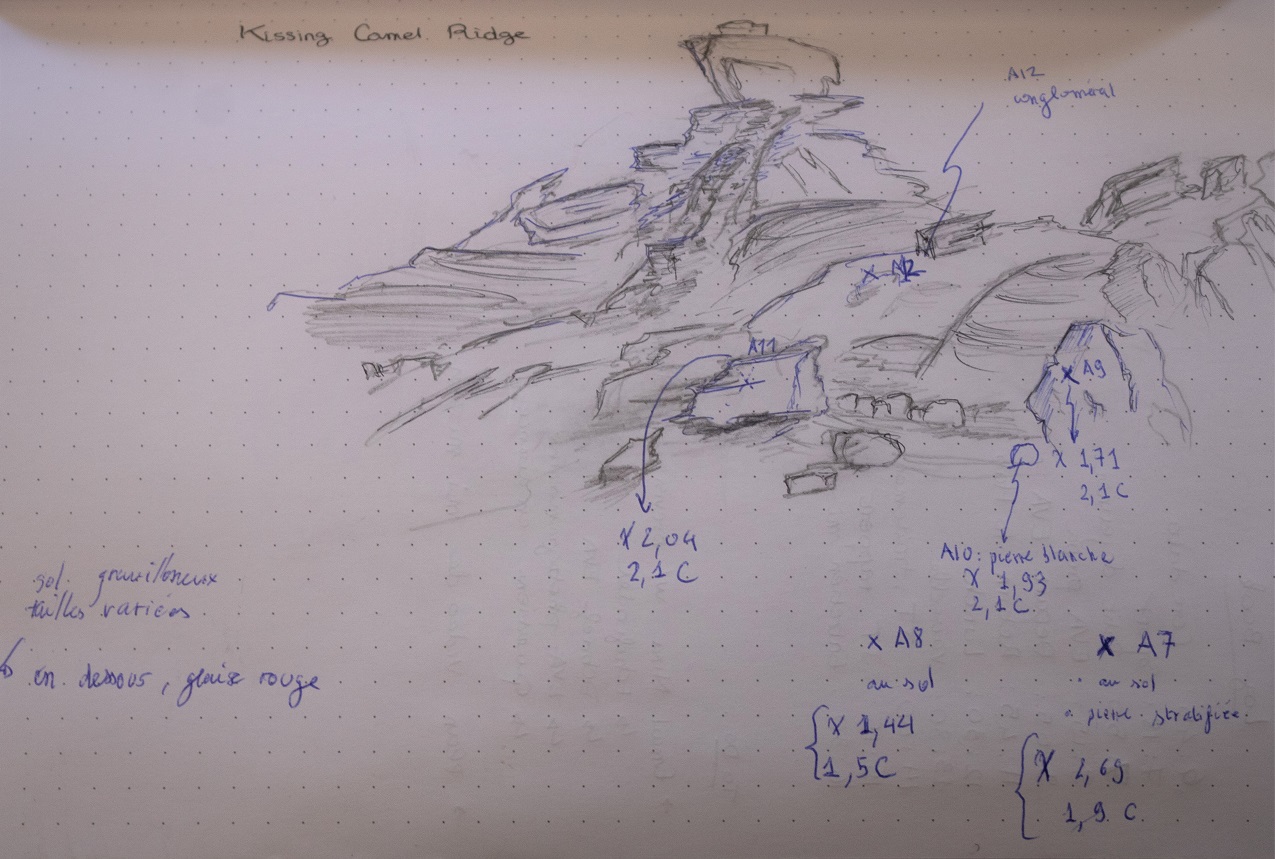 Today there were many opportunities to take great pictures, as I participated in the first geology EVA of the mission! Alice, our EVA leader, took Adrien, Jérémy, and I to Kissing Camel Ridge, just South of the MDRS. After exploring the area for a short while, Alice gave us instructions to draw the area we explored so that we could make note of where we had collected samples. She showed us how to choose rock samples and test them with the MetMet before collecting them. This instrument allows geologists to test the magnetic susceptibility and conductivity of rocks directly in the field; this way, one can determine the value of potential samples before even beginning to collect them.