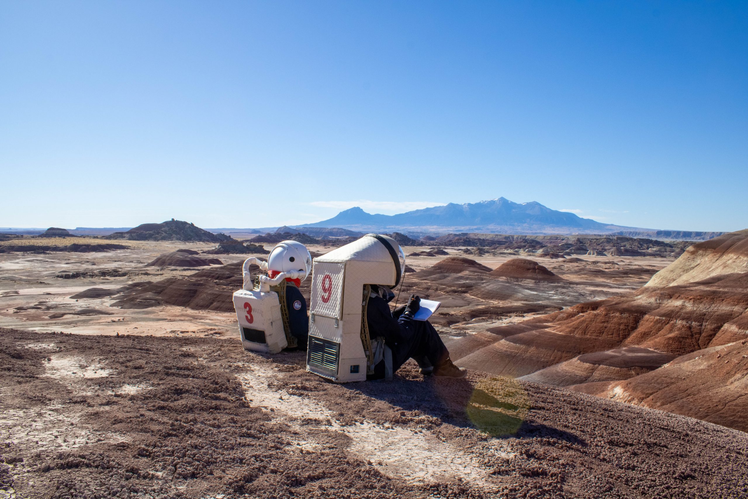 This morning, Meddi, Quentin, and Erin went on another EVA to sketch observations of the sand strata of the desert reliefs in the North Ridge area. This was Erin’s second EVA in as many days! It’s an intense experience since wearing an EVA suit has a similar effect to carrying a large backpack under the hot desert sun. This EVA also allowed us to retrieve a highly anticipated package: the “refill”! This consists of our supply boxes for the end of the mission. It’s very nice to have the choice to eat what we want, as we felt at lunch today, but it’s also important to manage our supplies well to have coherent and balanced meals until the last day.