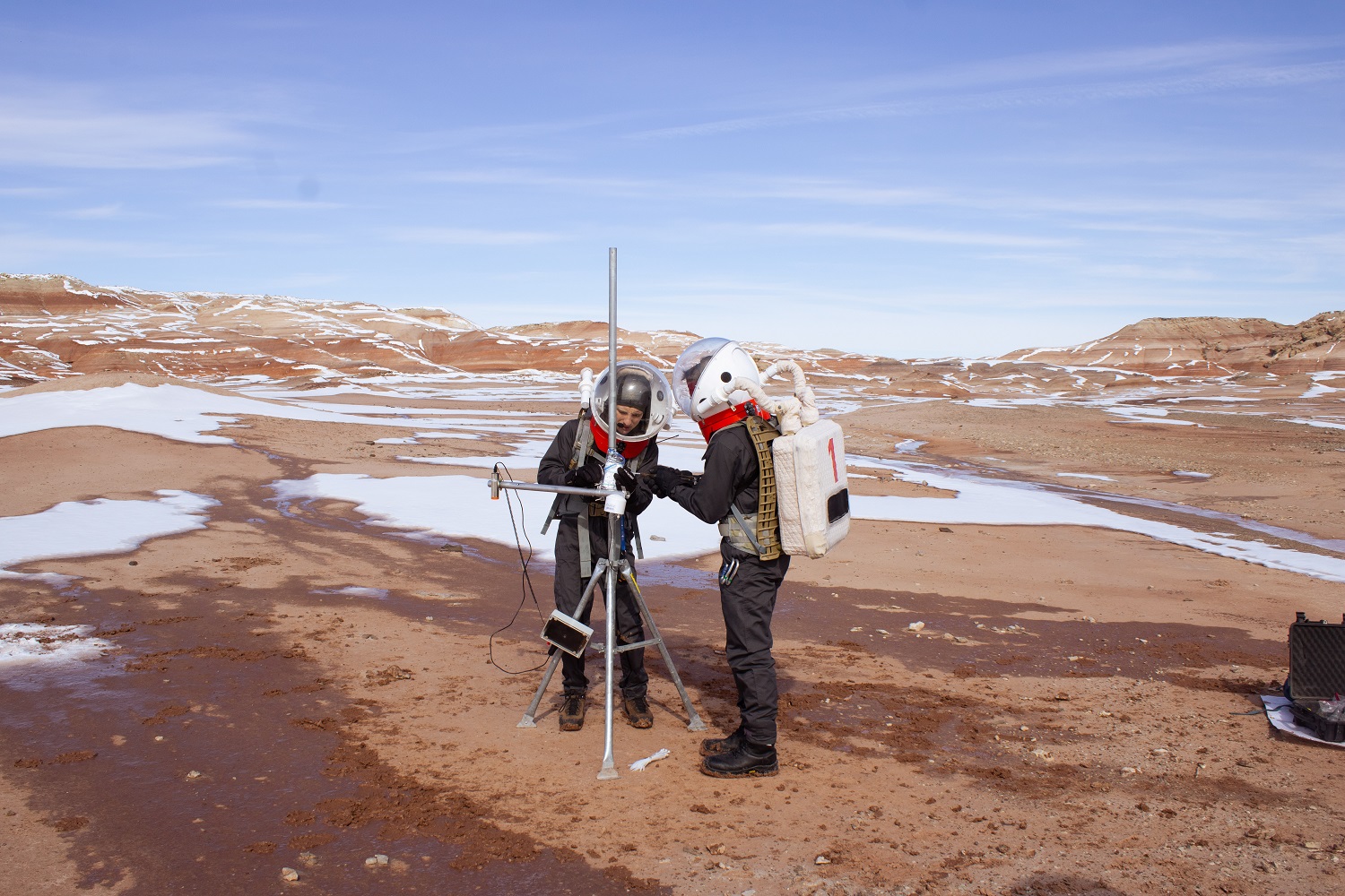 We awoke this morning to a perfectly well-warmed Upper Deck, indicating that the generator had made it through the night and won against the cold! After two days of unusual mornings, we were grateful to go back to our regular schedule, with a full-length workout session devised by our Health and Safety Officer focusing on proprioception, and a smooth daily health check. Jérémy told us tales of his previous missions in Antarctica over breakfast, before getting ready for the weather station EVA. Quentin, Alexandre and Jérémy suited up and headed out with their equipment, took the rovers, and went back to the MegaAres EVA site.