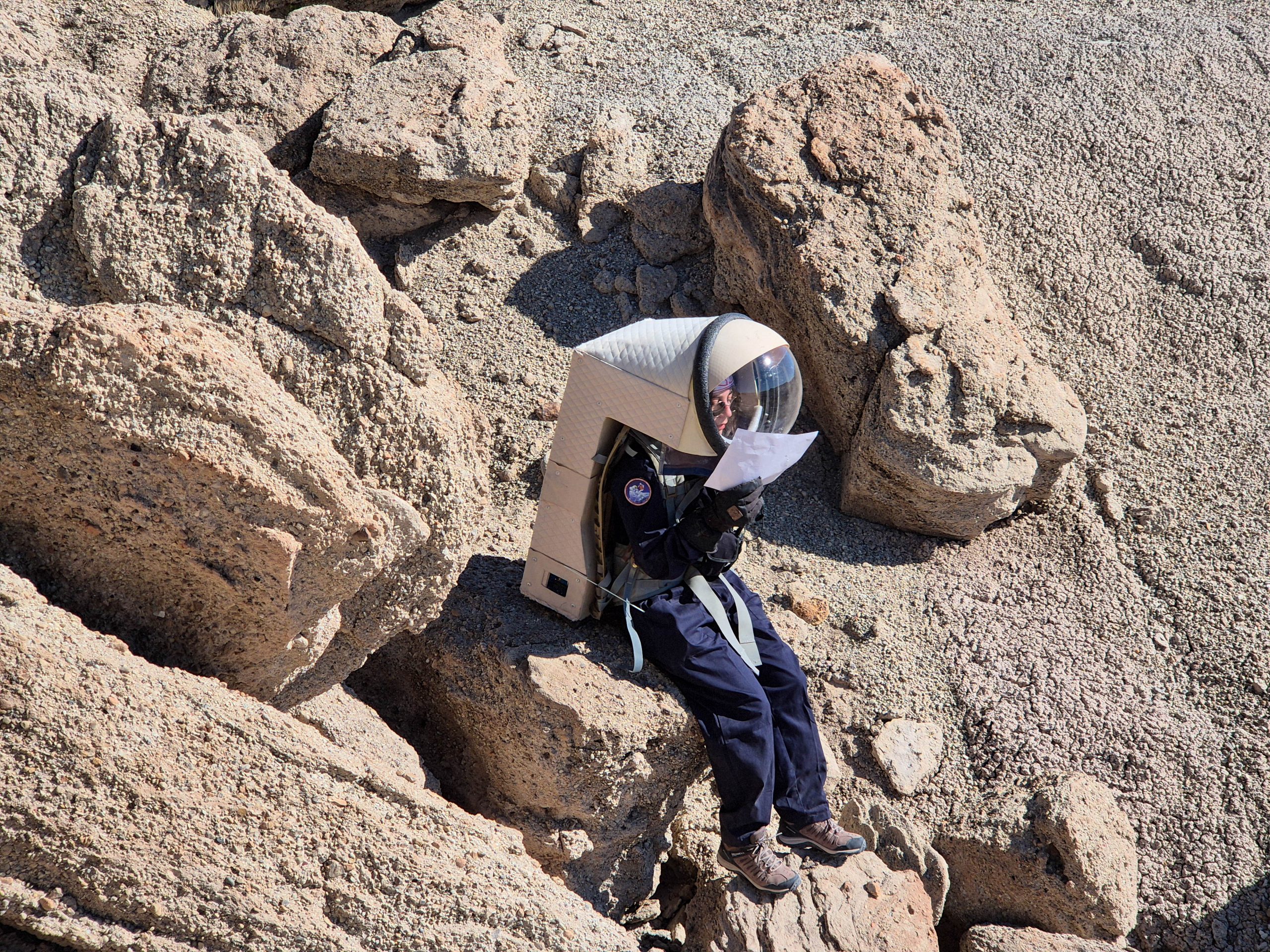 12:39 : Somaya, Robin et moi revenons de notre EVA du matin. Après avoir débuté la journée en douceur avec des étirements, nous avons enfilé nos combinaisons et sommes partis à Sea of Shells, à la recherche des balises. Nous les avons trouvées en moins d’une heure avec notre itinéraire, après avoir escaladé de nombreux amas rocheux du désert. Nous devions ensuite utiliser la route créée par les lycéens et collégiens de Mirepoix, et il s’est avéré que c’était, à quelques détails près, le chemin que nous avions emprunté ! Les paysages étaient oniriques, et après s’être imprégnés une dernière fois de cette vue splendide, nous avons quitté la région pour de bon.