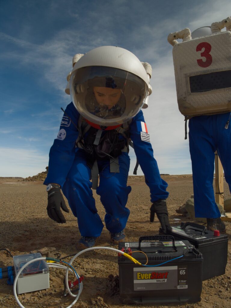 Today’s program: Two Extravehicular Activities (EVA). This morning, Julien, Adèle, and I conducted an EVA, with Lou serving as CapCom. Our primary objectives were to replace the batteries of the atmospheric instruments and to explore “Compass Rock,” a site located further from the station.
